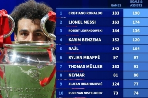 体育资讯4月15日讯 在欧冠淘汰赛次回合,利物浦0-2不敌巴黎。本场比赛萨拉赫替补登场没有参与进球,这也是他利物浦生涯欧冠最后一战。德转盘点了欧冠历史参与进球榜,其中萨拉赫位列第13位,具体如下(进球+助攻):